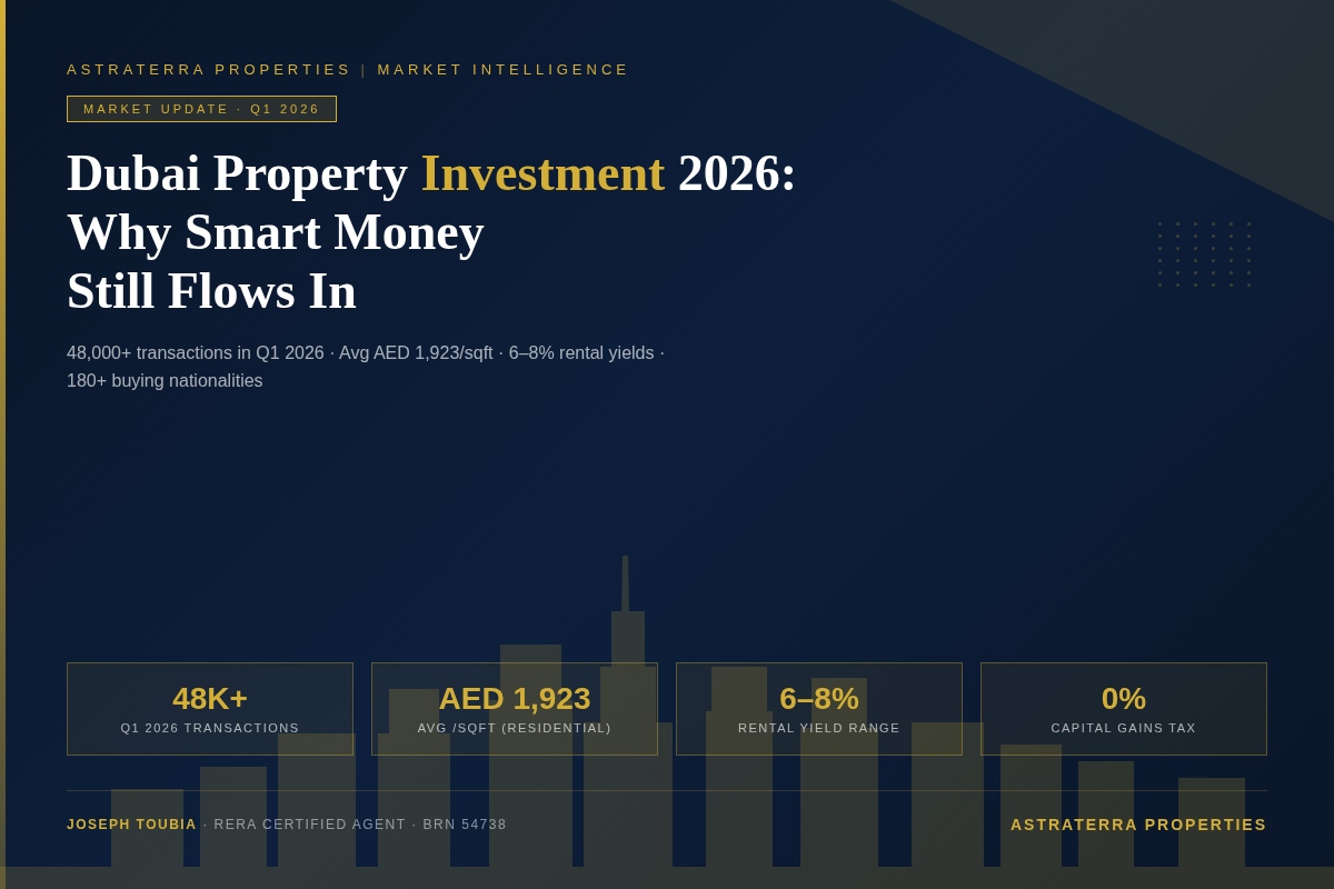 Dubai property investment 2026 continues to attract record capital despite global uncertainty — and for investors who look beyond the headlines, the data paints a compelling picture. Dubai recorded approximately 48,000 real estate transactions in Q1 2026, a 6% year-on-year increase, with average residential prices reaching AED 1,923 per square foot (Reliant Surveyors, March 2026). Off-plan apartments averaged AED 2,109/sqft, up from the December 2025 citywide average of AED 1,689/sqft. This is not a market running out of steam — it's a market maturing with momentum.