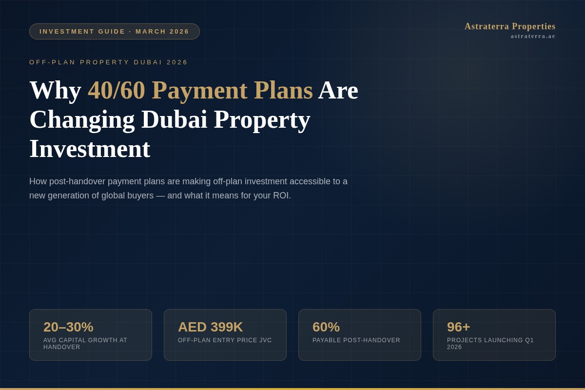 At Astraterra, we've seen a clear pattern in Q1 2026: buyers who entered off-plan projects in JVC, Business Bay, and Dubai Marina 18-24 months ago are now sitting on 20-30% unrealised gains — without having paid the full purchase price. That's the power of off-plan property investment in Dubai, and it's a dynamic that continues to reward early movers.