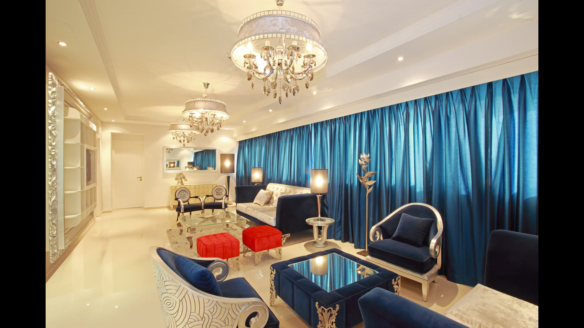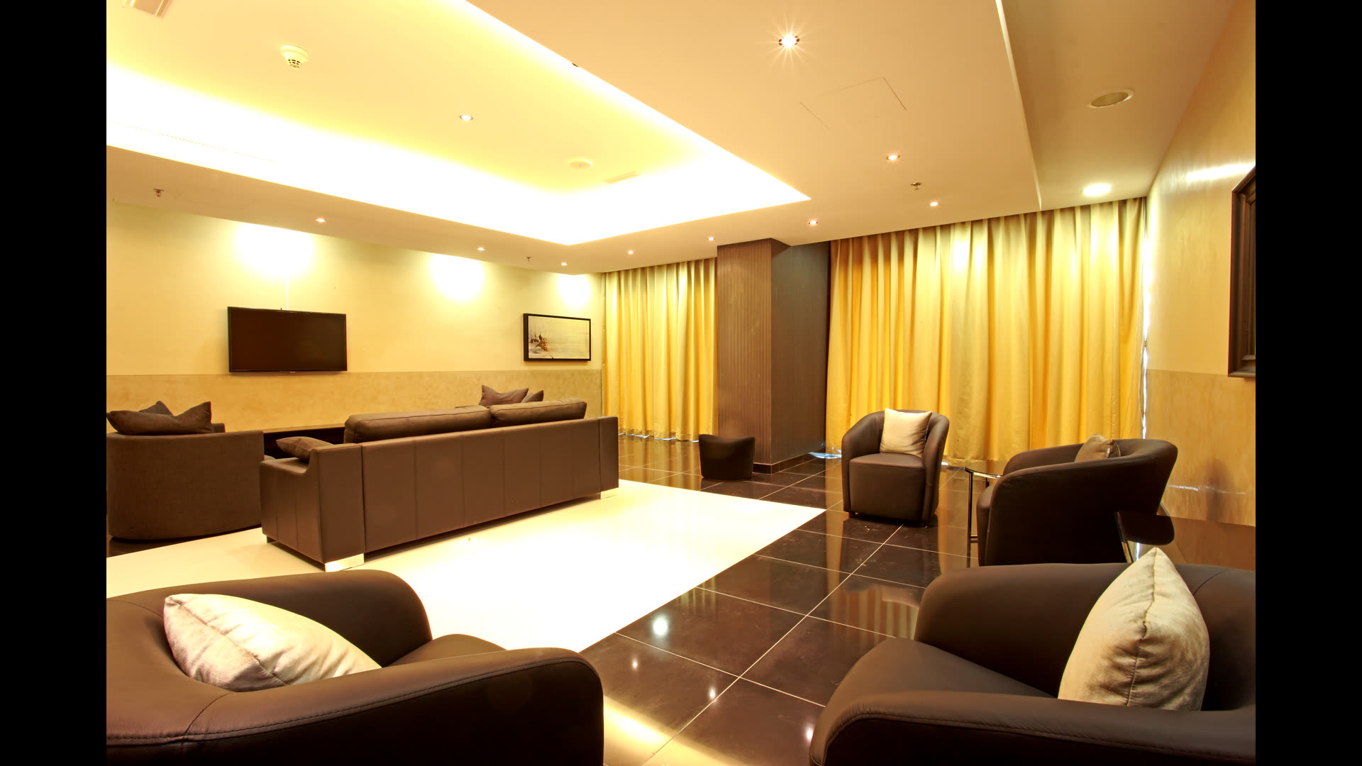 Premium finishes: marble flooring, granite vanity tops, built-in kitchen with stone countertops